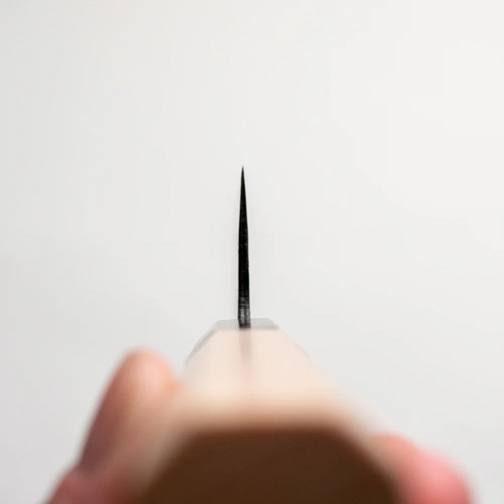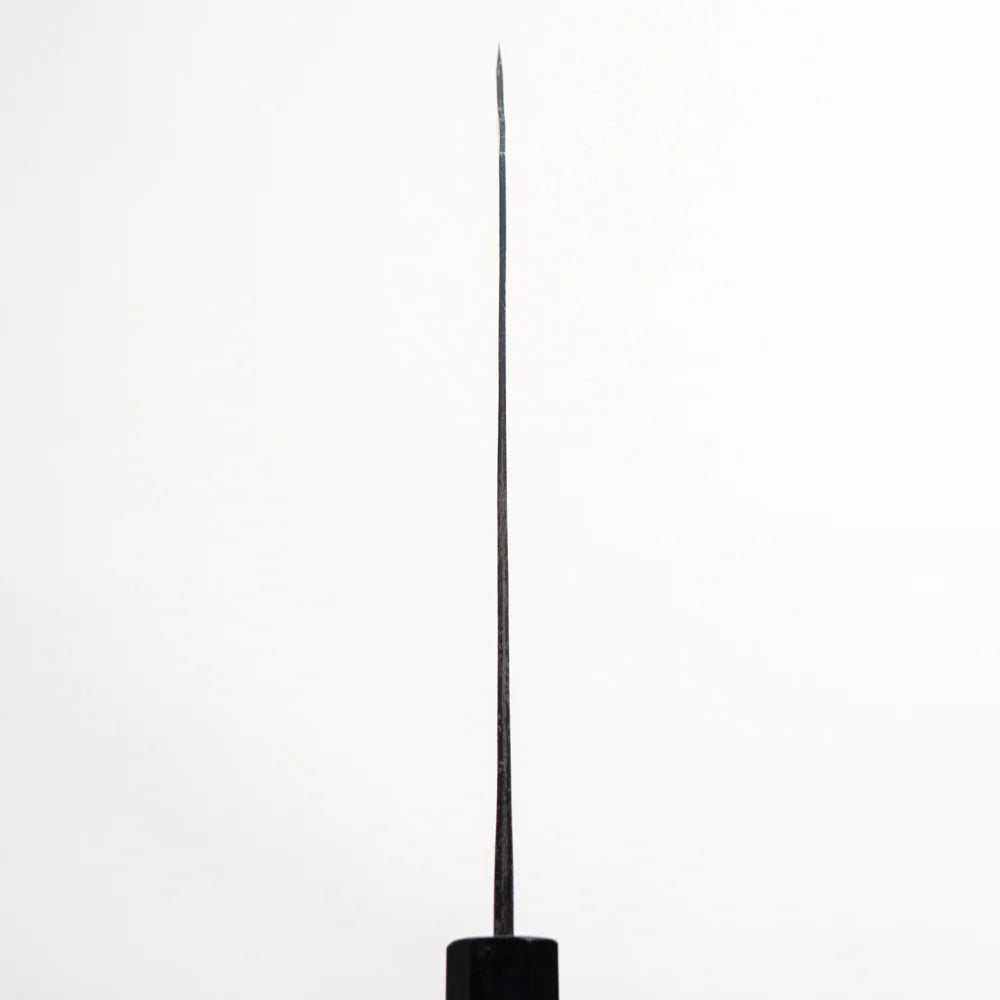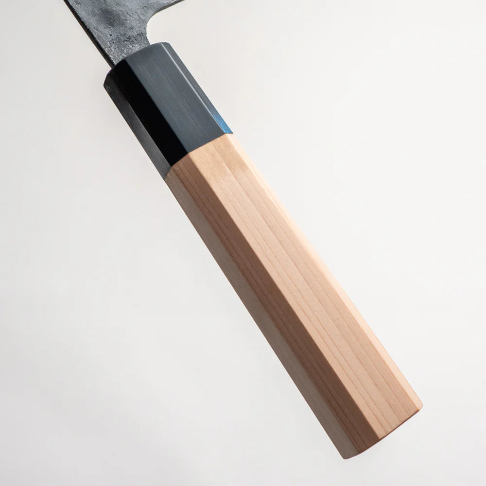 Forged from Blue Paper Steel No. 2 (Aogami #2), this knife combines carbon steel’s sharpness with improved toughness. The addition of small amounts of tungsten, chromium, and alloy carbides enhances hardness and resilience, making the edge more resistant to chipping and wear. Compared to White Paper Steel, Blue #2 offers longer edge retention while maintaining the same razor-sharp performance.